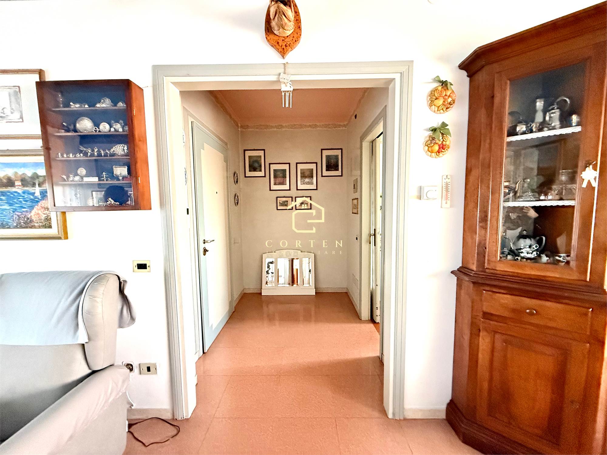 Ingresso, soggiorno, cucina abitabile, 2 camere matrimoniali e 1 singola, disimpegno, 2 bagni e terrazzo panoramico abitabile.