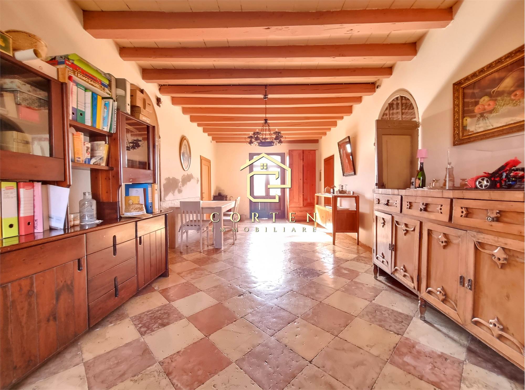 Al piano terra un corridoio porta all'ingresso principale dell'abitazione con finestrone ad arco che rende la zona giorno molto scenografica e luminosa, angolo cottura, soggiorno, bagno in marmo bianco con vasca, ripostiglio, studio, corridoio travato e pavimento originale dell'epoca, un ulteriore soggiorno e un ulteriore cucina abitabile.